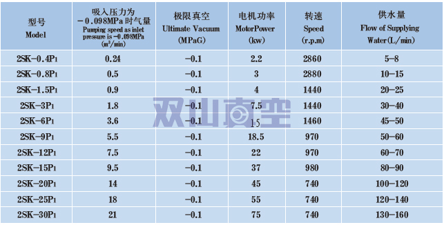 該類真空機(jī)組是由2SK系列兩級水環(huán)真空泵在吸入口加裝大氣泵組成,最低吸入壓力可達(dá)0.5~1kPa(A),在吸入壓力為1 ~ 6kPa(A) 之間仍有較大抽速,因此適合于在較高真空下工作。